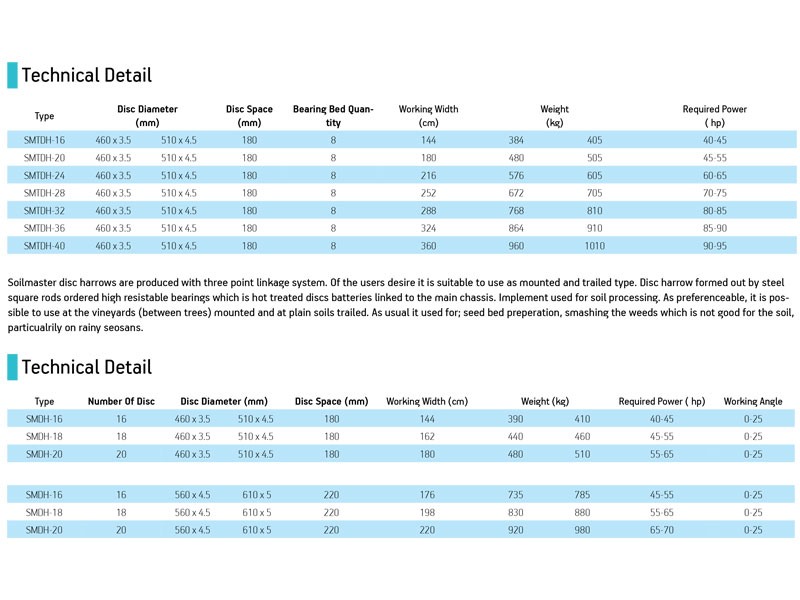 Soil Master model is a light type disc harrow having the feature to use hydraulic.It is used to mix the seed bed breaking up the clods a er plow and mixing in the soil.It breaks up the weed resudues and weeds in perfect manner.It can be easily drawn up by the three thanks to its travel in the garden agriculture.In this way soil cultivation is made without damaging to tree branches.
